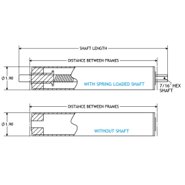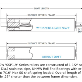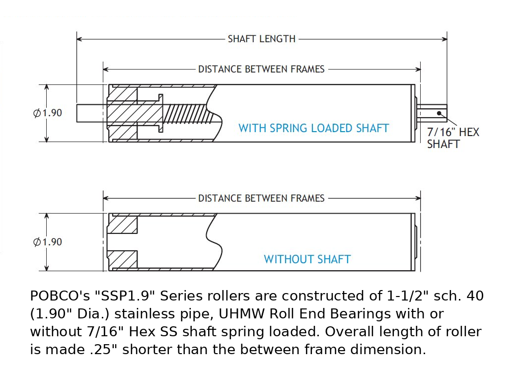POBCO's "SSP1.9" Series rollers are constructed of 1-1/2" sch. 40 (1.90" Dia.) stainless pipe, UHMW Roll End Bearings with or without 7/16" Hex SS shaft spring loaded. Overall length of roller is made .25" shorter than the between frame dimension.