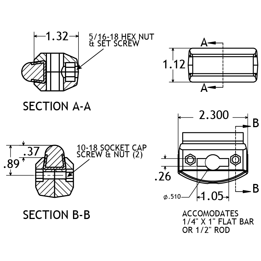 PLASTIC RAIL CLAMP FOR GUIDE RAIL – FLAT BAR OR ROUND ROD SUPPORT HOLE
